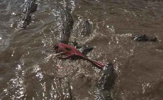 ワニに食いちぎられるモラ・ラム