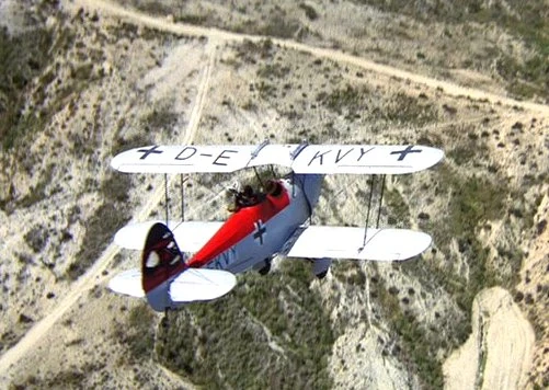 In 1938, Indiana Jones and his father, Henry Jones, Sr. used D-EKVY to escape from a zeppelin, and crash landed it after an air battle.