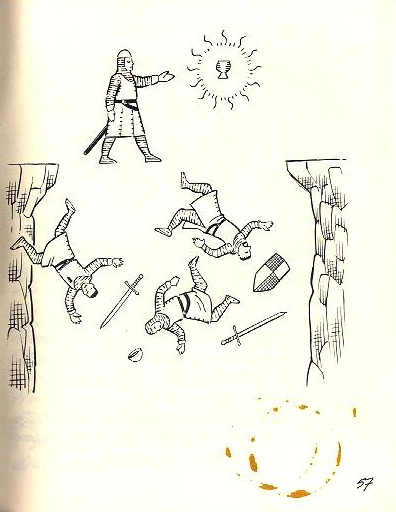 A significant part of the text (pp. from 9–21) are the various inconsistent descriptions of the Holy Grail in various legends, texts and references. Basically, this served as a copy protection: clues about the appearance of the Grail were scattered through the actual game. These clues were random from time to time, so the player had to use the 'Diary's' information in order to decide which was the correct Grail in the end.