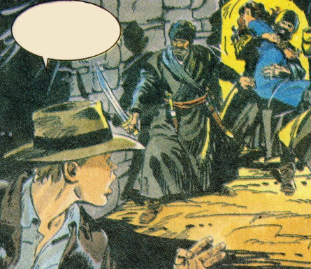Herded with other slaves, the boys were paraded around the potential buyers. Separated from Omar, Indiana's turn came to be put on auction and his good health started a bidding war between a black robed stranger and a man in yellow turban. The black robe eventually won out and Indiana was carried away to meet his new owner. Once again the figure unveiled himself to be Walter Harris, who had managed to track him to the city. Indiana was grateful for his rescue but discovered the journalist had no intention of saving Omar.[24]