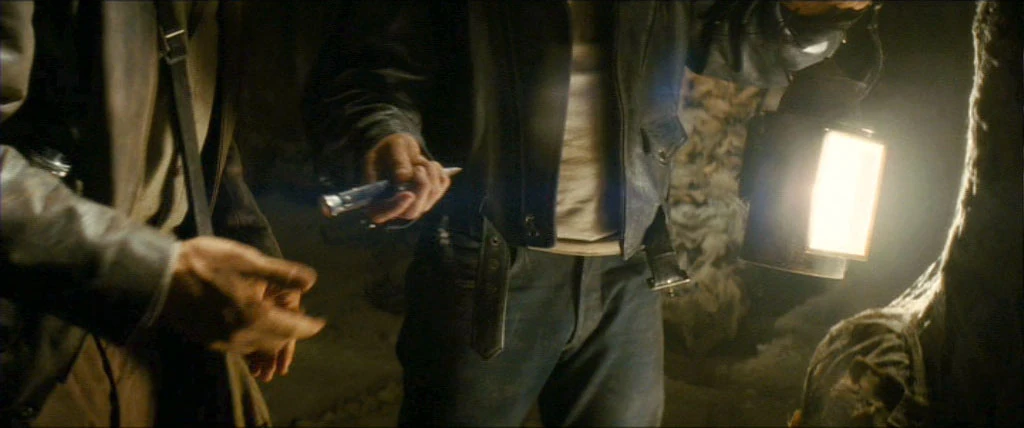 Mutt passing his knife to Jones in Orellana's tomb
