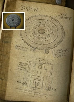 The Nubian Plate was round plate, set upright on two legs. Its design featured several concentric rings with simple patterns of dots or markings, and a small recess in the center. It was hidden in a temple in Sudan.[1]