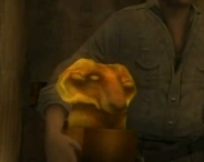 In 1939, Magnus Völler and his German Desert Commandos had arrived at the temple and started searching for the ram's head idol, entering the pyramid through the main entrance. Indiana Jones found the back entrance of the temple through a cave in the mountains, and reached the room containing the idol first. As he entered the chamber, the dais around the idol's pedestal fell away, and flames erupted around the bust. Jones used his whip to pull the idol towards him, and carried it through some of the traps of the structure.[1]