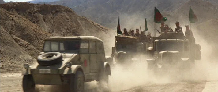 The Kübelwagen (left) and troop carriers pursuing Jones.