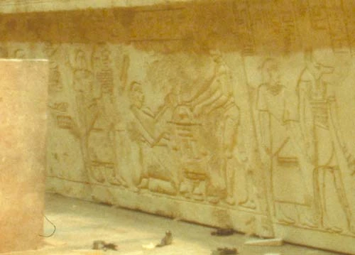 The Well of the Souls was built after the Ark of the Covenant was taken to Tanis, Egypt by Pharaoh Shishak around the year 980 BC.[4] A vault,[3] part of a temple commissioned to honor the Egyptian war dead who fell in Shishak's military campaign against the Israelites, was used to hide the Ark from Amun-Ra, the Egyptian sun god. The Ark was removed from the pharaoh's palace[4] and placed in a stone sarcophagus within the Well,[1] far from the sight of man or god.[4] The upraised arms of a quartet of colossal Anubis statues supported the ceiling of the Well,[1] while a series of nearby chambers contained sarcophagus and mummies of royal attendants.[5] The hieroglyphics on the stone chest holding the Ark told that the pharaoh Shishak had commissioned the Well of the Souls to contain the Ark.[6] Snakes were also a preventive measure, meant to discourage and possibly kill those who wanted to take the Ark for their own purposes.[4] A Map Room was built to help locate the resting places of the Ark,[1] its floor tiles divided the solar year into a calendar, so that the Well of the Souls could be found at any time of year with a correctly proportioned Staff of Ra.[7]